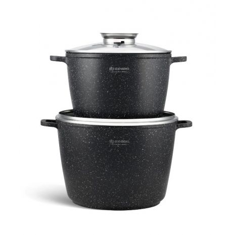 Δύο πολύ ψηλές κατσαρόλες 28 & 24 cm με αντικολλητική επίστρωση μαρμάρου ιδανικές για σούπες, στιφάδο, κρέας με σάλτσα, βράσιμο και για μεγάλες ποσότητες φαγητού.